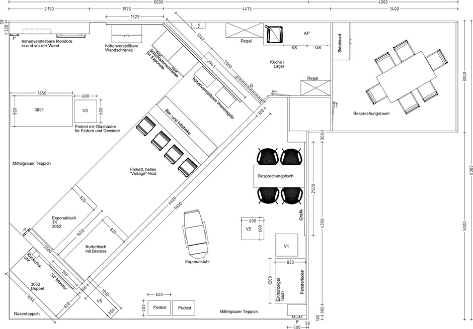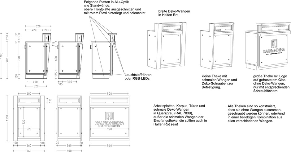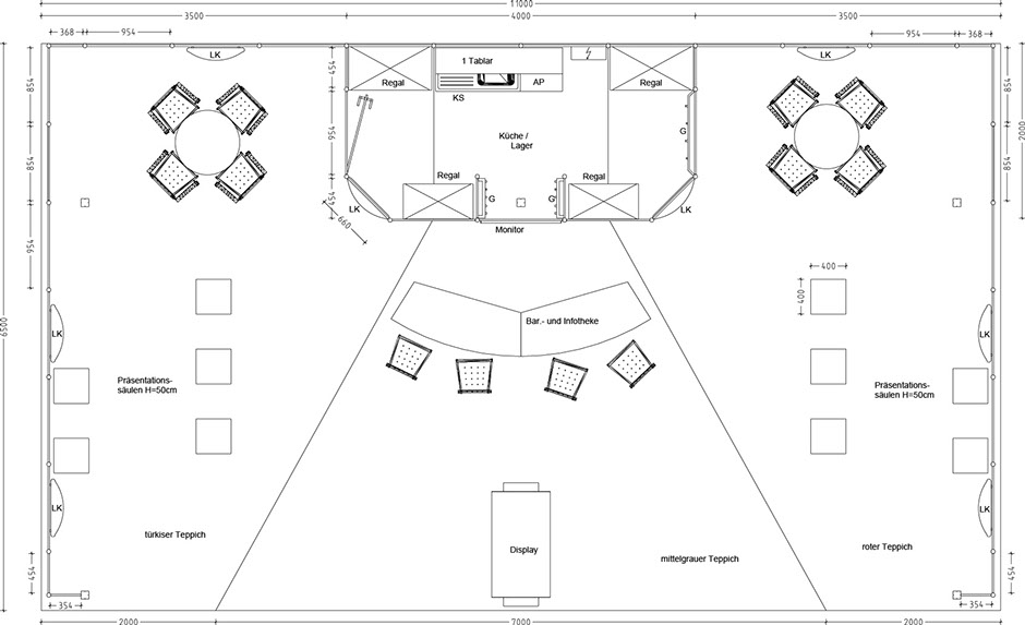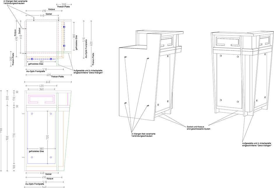 Natürlich fertigen wir nicht nur bunte Bilder, sondern auch Pläne für den Aufbau, sowie Detailzeichnungen von z. B. Theken oder sonstigem Standmaterial.